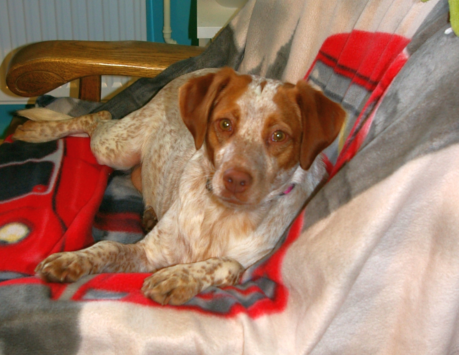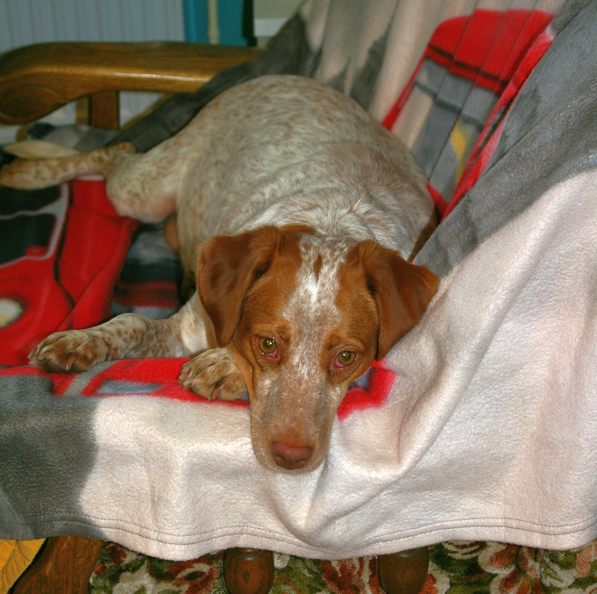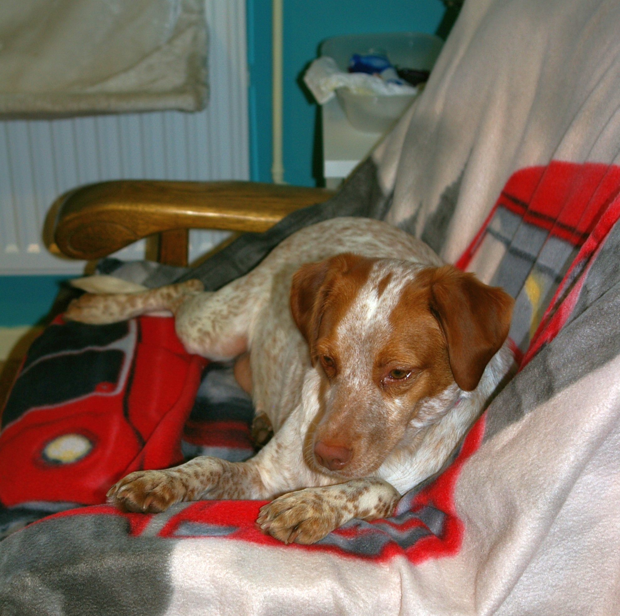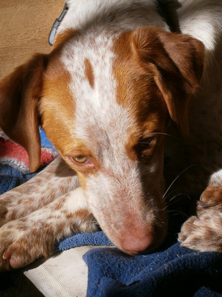 Below: Priyā on the fourth day in her new home. She has made herself comfortable in “her” new chair. She is started to get house-trained and knows and reacts to her new name. She is also getting on better with the cats. She gets on fine with Candy and Yonah anyway. We visited the vet yesterday. 19.25 kg dog - and not much muscles. We got our work cut out.